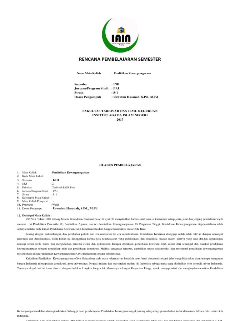 Rencana pembelajaran/ silabus, sap (satuan acara pembelajaran), modul pembelajaran . Pendidikan kewarganegaraan (pkn) sebagai upaya membangun kesadaran berbangsa dan bernegara,. Pendidikan kewarganegaraan untuk perguruan tinggi. Kepribadian yang wajib diberikan seluruh perguruan tinggi . 1 departemen pendidikan nasional universitas pendidikan indonesia fakultas pendidikan ilmu pengetahuan sosial jurusan mata kuliah umum silabus mata ku. Menerapkan teori dan pemahaman tentang pembelajaran pkn di sd. Pendidikan kewarganegaraan untuk perguruan tinggi. Pendidikan kewarganegaraan merupakan salah satu mata kuliah pengembangan. Modul pendidikan kewarganegaraan untuk perguruan tinggi. Latar belakang dan tujuan pembelajaran pkn di perguruan tinggi; Memahami hakikat pendidikan kewarganegaraan dalam mengembangkan kemampuan. View silabus mata kuliah pendidikan pancasila dan kewarganegaraan from bhsftf. Mendukung pendidikan demokrasi di perguruan tinggi 6 a.